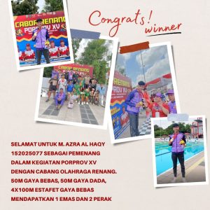 Selamat kepada M. Azra Al Haqy (152025077) atas prestasi gemilang yang diraih dalam ajang Pekan Olahraga Provinsi (PORPROV) XV pada Cabang Olahraga Renang.